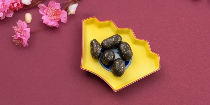 豆徳の看板商品・竹炭豆に、金粉を贅沢にまぶしました。冬季限定の特別な豆菓子です。ピリッと甘辛い醤油味に、金色の輝き。お正月や特別な日のお菓子として、華やかな存在感を放ちます。
